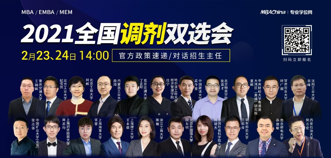 掌握先机,决战调剂。为了方便广大考生更好地了解公司调剂信息,也为了进一步服务于需要调剂的考生,公司与MBAChina、专业学位网携手举办“2021年全国管理类专业调剂双选会”,并于2021年2月24日17:00--17:20在线直播。同学们在此可以全面了解公司的MBA项目,包括项目政策、调剂注意事项、复试备考指南等信息,欢迎各位考生报名。